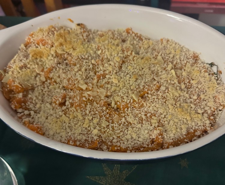 Transfer the mash to an oven-proof dish, sprinkle with parmesan and crumbs, and bake at 150°C for around 10 minutes—just enough to create a light golden topping.