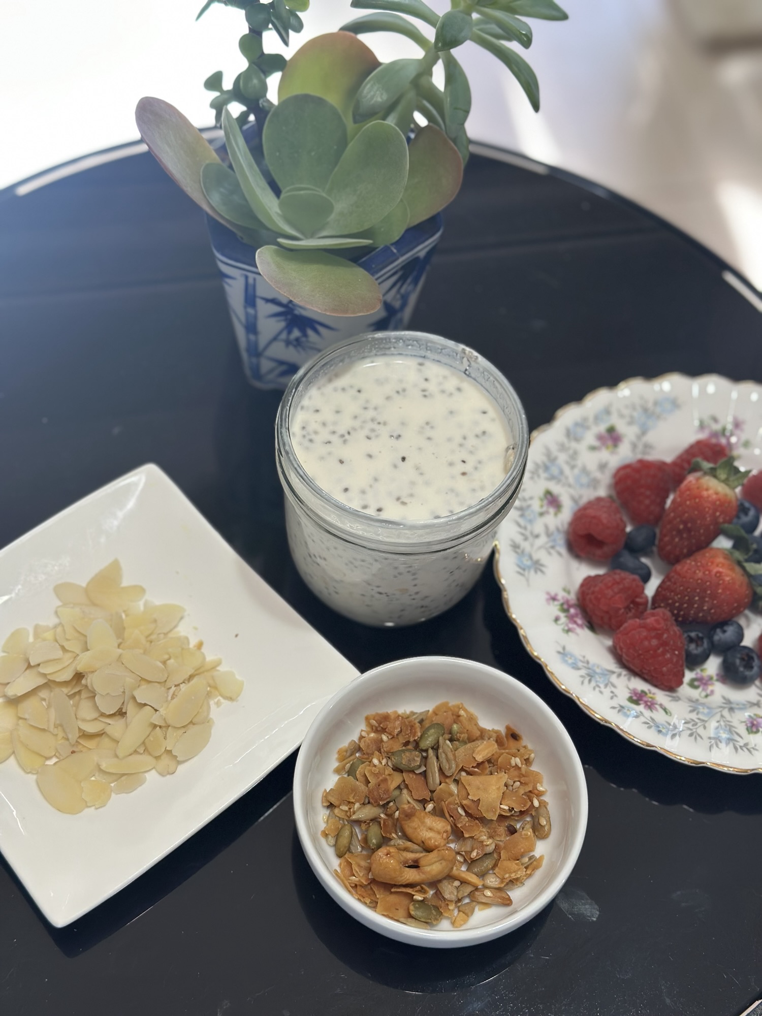 | Day 6 | Yoghurt and chia pudding with fruits of your choice. | Smoothie with your choice of fruits (e.g. mango, berries), chia seeds, topped with coconut flakes and cacao nibs. |